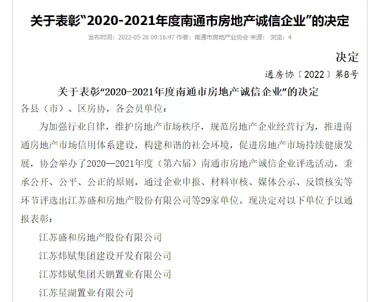 近日,南通市房地產(chǎn)業(yè)協(xié)會公布了關(guān)于表彰“2020-2021年度南通市房地產(chǎn)誠信企業(yè)”的決定。決定指出,協(xié)會秉承公開、公平、公正的原則,通過企業(yè)申報、材料審核、媒體公示、反饋核實等環(huán)節(jié)評選出江蘇盛和房地產(chǎn)股份有限公司等29家單位,予以通報表彰。
